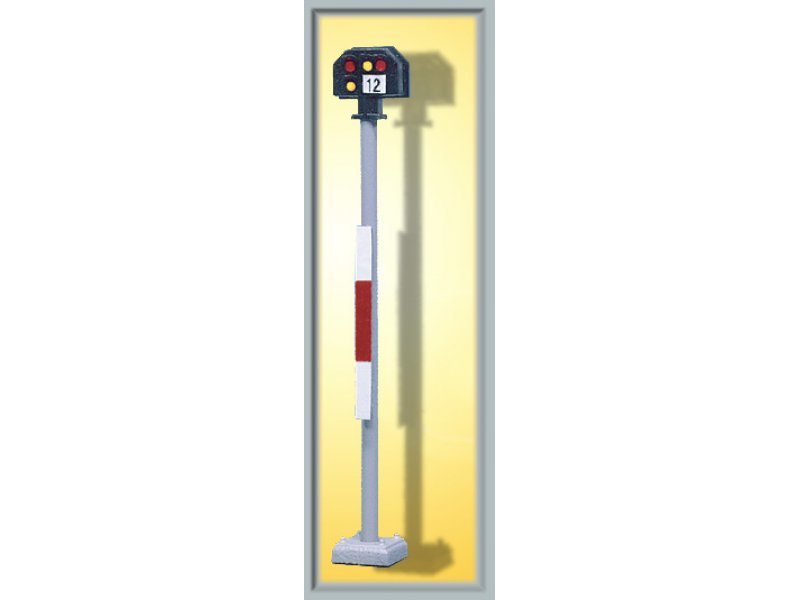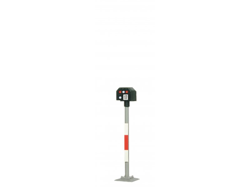 Signal der Einheitsbauart. Filigraner Messingmast in originalgetreuer Lackierung. Patentsteckfuß für einfache Montage. Mit je 2 roten und weißen LEDs, wartungsfrei. Signalbilder Sh0 und Sh1. Passendes Steuermodul: Art. 5221. Höhe: 2,3 cm.