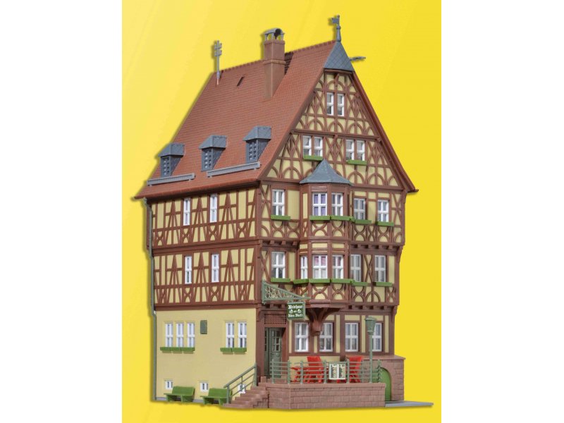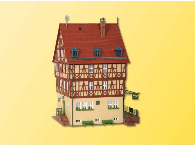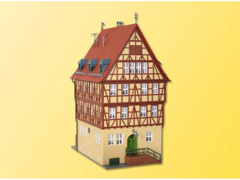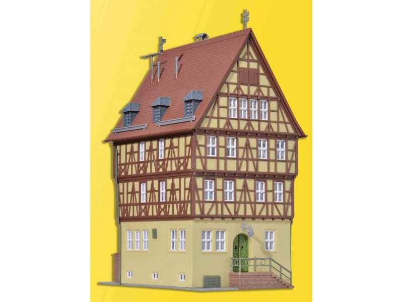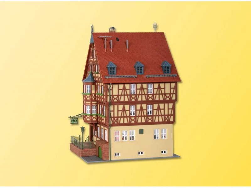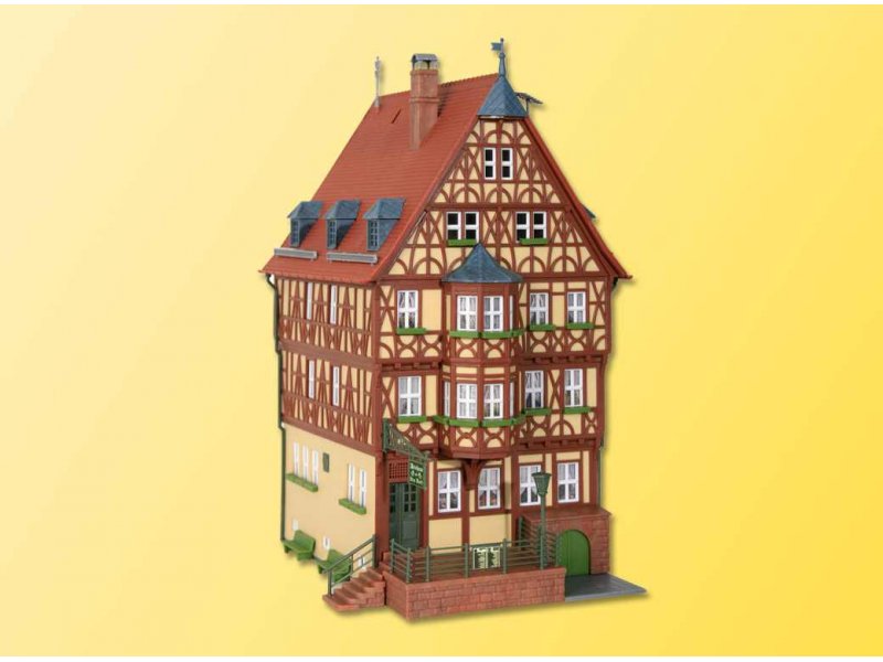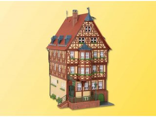 Bausatz. Die besondere Eigenart und die reiche Vielfalt der fränkischen Fachwerkbauten gipfeln in den ausgewählten Häusern am Marktplatz von Miltenberg am Main. Die Originale sind am Anfang des 16. Jahrhunderts entstanden. In ihrem Gleichklang von Zweckmäßigkeit und harmonischem Aufbau unterscheiden sich die vier Häuser wohltuend von manchen anderen Gebäuden. Bei häufig eng gezogenen Grundstücksgrenzen in mittelalterlichen Städten blieb den Erbauern nur in der Vertikalen eine hinreichende Ausdehnungsmöglichkeit. Charakteristisch für die fränkische Fachwerkbauweise ist die schmale Ständerordnung der Fachwerkkonstruktion und die auffällige Betonung der vertikalen Gefügeelemente. Das Miltenberger Ensemble von kibri besteht aus 4 harmonisch gestalteten Fachwerkbauten. Neben dem Haus mit Erker gibt es das Torhaus Art. 38901, das Fachwerk-Eckhaus Art. 38904 und das Fachwerkhaus am Markt Art. 38903. Die Hölzer zeigen im Modell braune und rotbraune Farben in unterschiedlichen Tönungen, die den Kontrast zu den hellen, meist weißen Gefachen betonen. Das kommt besonders im gewählten H0-Maßstab zur Geltung. Die Miltenberger Häuser lassen sich sehr wirkungsvoll mit bereits vorhandenen Stadthäusern von kibri kombinieren. Mit Stecksystem. Hergestellt im Zweifarben-Spritzgießverfahren. Maße: L 15 x B 11 x H 20,5 cm. Schwierigkeitsgrad: 2 (Fortgeschrittene).