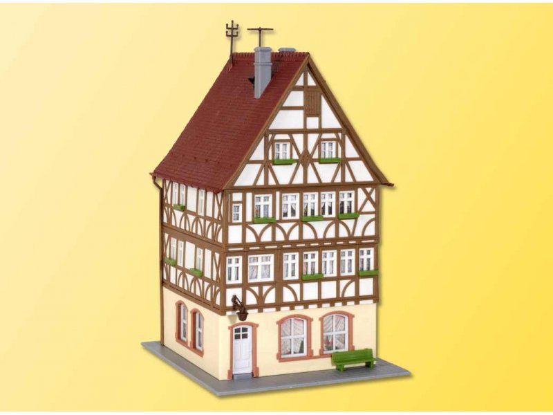 Bausatz. Die besondere Eigenart und die reiche Vielfalt der fränkischen Fachwerkbauten gipfeln in den ausgewählten Häusern am Marktplatz von Miltenberg am Main. Die Originale sind am Anfang des 16. Jahrhunderts entstanden. In ihrem Gleichklang von Zweckmäßigkeit und harmonischem Aufbau unterscheiden sich die vier Häuser wohltuend von manchen anderen Gebäuden. Bei häufig eng gezogenen Grundstücksgrenzen in mittelalterlichen Städten blieb den Erbauern nur in der Vertikalen eine hinreichende Ausdehnungsmöglichkeit. Charakteristisch für die fränkische Fachwerkbauweise ist die schmale Ständerordnung der Fachwerkkonstruktion und die auffällige Betonung der vertikalen Gefügeelemente. Das Miltenberger Ensemble von kibri besteht aus 4 harmonisch gestalteten Fachwerkbauten. Neben dem Fachwerkhaus am Markt gibt es das Haus mit Erker Art. 38902, das Fachwerk-Eckhaus Art. 38904 und das Torhaus Art. 38901. Die Hölzer zeigen im Modell braune und rotbraune Farben in unterschiedlichen Tönungen, die den Kontrast zu den hellen, meist weißen Gefachen betonen. Das kommt besonders im gewählten H0-Maßstab zur Geltung. Die Miltenberger Häuser lassen sich sehr wirkungsvoll mit bereits vorhandenen Stadthäusern von kibri kombinieren. Mit Stecksystem. Hergestellt im Zweifarben-Spritzgießverfahren. Maße: L 9,8 x B 11 x H 17,5 cm. Schwierigkeitsgrad: 2 (Fortgeschrittene).