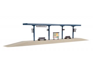 Dieser Bahnsteig ist bei geringerem Gleisabstand einzusetzen, z. B. nach Bogenweichen. Bahnsteighöhe: 1,2 cm. Maße: L 37 x B 3,4 x H 6,8 cm.