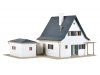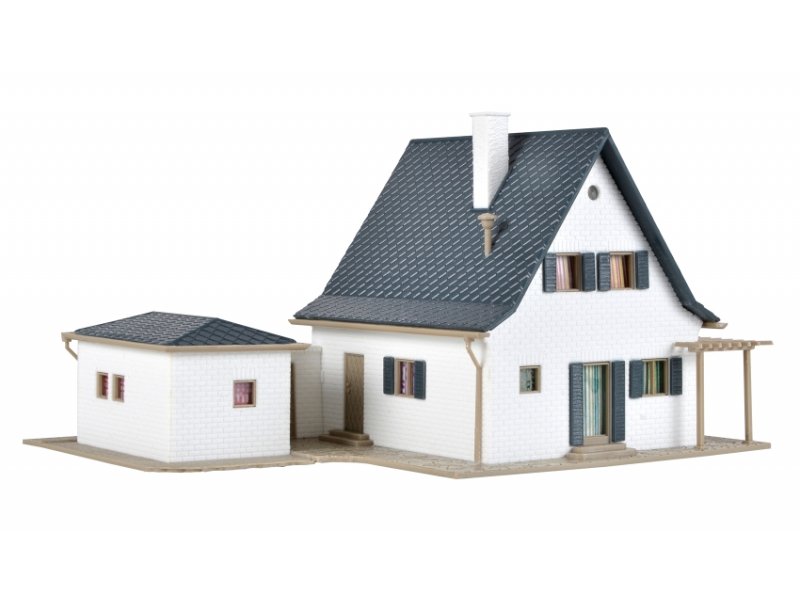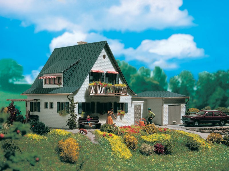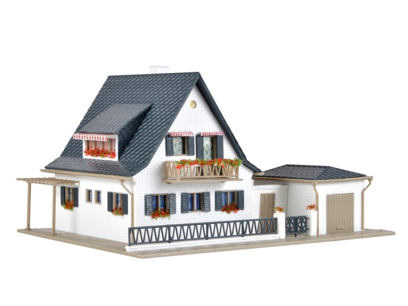 Mit Balkon, Terrasse und Gartenzaun. Maße: Wohnhaus L 11,5 x B 12 x H 8,8 cm, Garage L 7,7 x B 4,5 x H 3,7 cm.