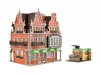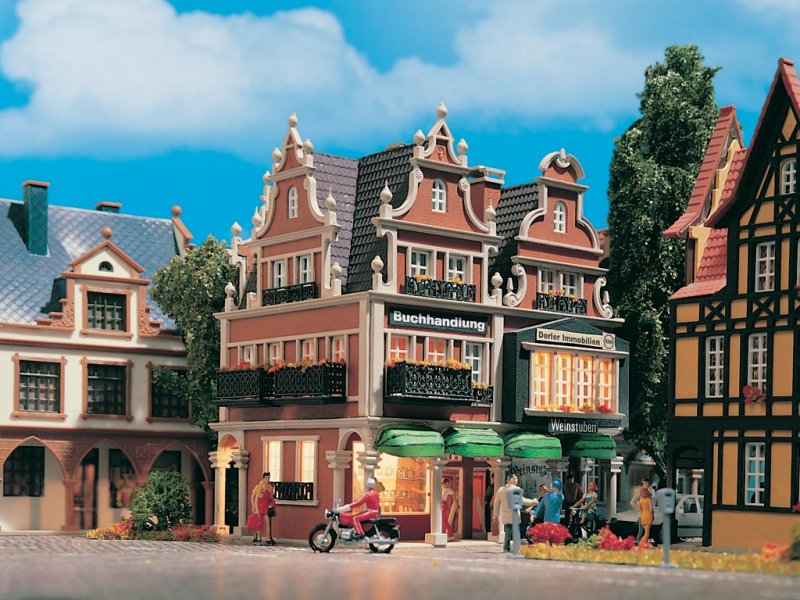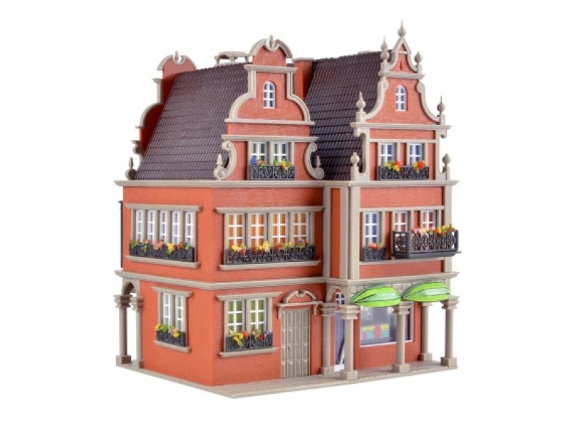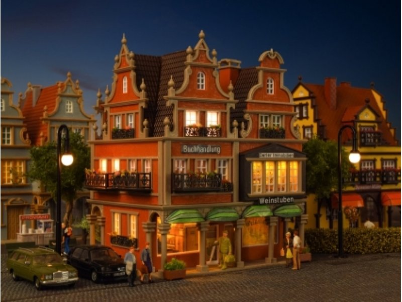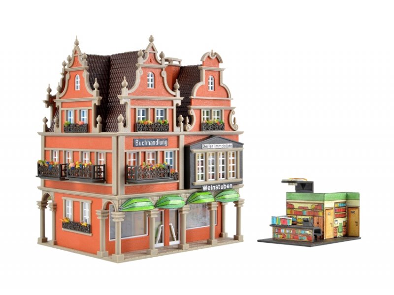 Funktionsbausatz. Dieses vielseitige Wohn- und Geschäftshaus bietet im Erdgeschoss Platz für eine Buch- und eine Weinhandlung. Die beiliegende Beleuchtung setzt den Verkaufsraum der Buchhandlung ins rechte Licht. Filigrane Eisengitter an den Balkonen und aufwendig gestaltete Dachgiebel prägen das Gebäude. Maße: L 11,5 x B 10 x H 13,5 cm.