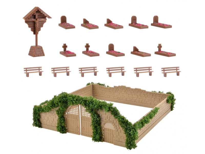 Dieser ländliche Friedhof könnte z. B. an eine Kirchenmauer angebaut werden oder auch frei für sich stehen. Der Bausatz beinhaltet mehrere Gräber, ein Kreuz sowie die Friedhofsmauer, Blumenflocken und Belaubungsmaterial. Maße: L 14 x B 14 x H 5 cm.