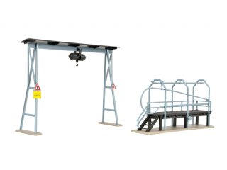 Durchfahrtshöhe: 6,5/8,2 cm, Durchfahrtsbreite: 10,5 cm. Maße Bockkran: L 12,5 x B 3,2 x H 9 cm, Gerüst: L 10 x B 2,6 x H 5 cm.