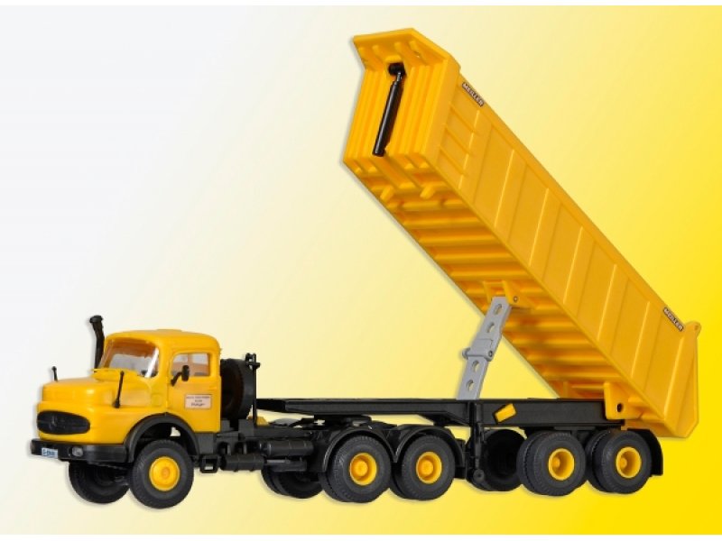 Bausatz. Vorbilddaten: MERCEDES-BENZ LAK 2624, 117 kW/240 PS Dieselmotor, MEILLER Hinterkipp-Sattelauflieger MHKS 38/2, Nutzlast ca. 23,2 t, Gesamtzuggewicht 38 t. Maße: L 14 x B 3,5 x H 3,8 – 8,8 cm. Schwierigkeitsgrad: 2 (Fortgeschrittene).
