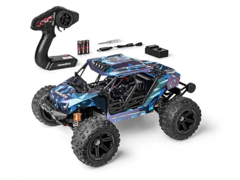 Ein viel zu frecher Flitzer den man gerne unterschätzt. Mit seinem 7.4 V Lilon-Akku mit 1300 mAh und seinem Vierradantrieb bringt das Fahrzeug eine ordentliche Kraft auf die Achsen und ist außerdem extrem geländefähig. Die einstellbaren Stoßdämpfer sowie die griffigen Reifen mit Profil lassen den Nemesys selbst durch schweres Gelände gleiten wie einen Wüstenadler. Die Komponenten des RC-Fahrzeugs sind spritzwassergeschützt und lassen Regen und Staub keine Chance! Bei vollem Einsatz bei bis zu 35 Km/h Vmax sorgen ganze 30 Minuten Fahrzeit für eine beeindruckende Statistik. Durch die mitgelieferten Batterien und Akku ist der NemeSys sofort fahrbereit.