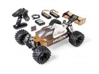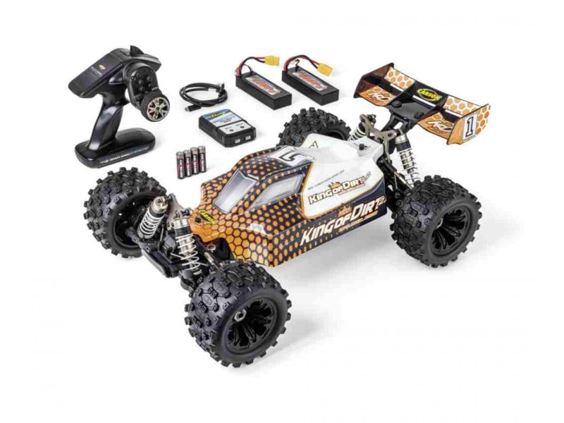 Ausgeliefert wird der King of Dirt 2.0 mit einem störungsfreien 2.4 GHz Fernsteuerungssystem, 2x Lipo Fahrakkus 7,4 V / 3.800 mAh, einem Ladegerät, 4x Senderbatterien LR06 / AA, und einer ausführlichen Bedienungsanleitung.