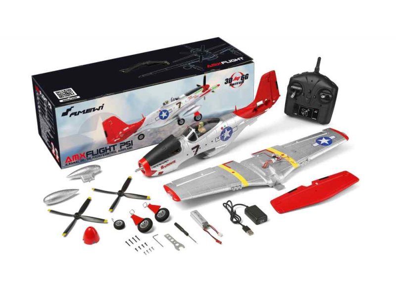 Die AMX P51 ist ein Semi-Scale-Nachbau dieses bekannten Flugzeugs in der Red-Tail-Lackierung. Optik und Flugeigenschaften, gerade bei der Größe, überzeugen – durch 3D/6G Gyro ist das Modell auch einsteigertauglich. Hauptmaterial ist ein crash-resistenter Schaum und als Antrieb ist ein 1806 Hochleistungs-Brushless-Motor verbaut, der dem Flieger sehr sportliche Leistungsfähigkeiten verleiht. Die präzisen digitalen 2g Servos sorgen dabei für eine maximale Kontrolle auf allen Achsen des Modells und sind bereits fertig eingebaut. Die Hauptplatine ist zusätzlich mit 3V und 5V Ausgängen versehen, um z.B. S-Bus und DSM-Empfänger bestehender Sendersysteme (z.B. Futaba, Spektrum, Radiomaster usw.) nutzen zu können. Wenn kein Sendersystem vorhanden ist, kann einfach der mitgelieferten 2,4GHz Sender in Mode 2 verwendet werden. Gut in der Hand liegend verfügt dieser über alle erforderlichen Steuerkontrollen.