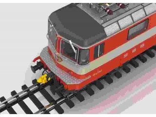 Modell: Mit Digital-Decoder mfx+ und umfangreichen Geräuschfunktionen. Geregelter Hochleistungsantrieb mit Schwungmasse, zentral eingebaut. Alle vier Achsen über Kardan angetrieben. Haftreifen. Fahrtrichtungsabhängig wechselndes Dreilicht-Spitzensignal und ein weißes Schlusslicht (Schweizer Lichtwechsel) konventionell in Betrieb, digital schaltbar. Beleuchtung umschaltbar bei Solofahrt auf ein rotes Schlusslicht. Spitzensignal an Lokseite 2 und 1 jeweils separat digital abschaltbar. Rangier-, Warn- und Falschfahrsignale sind digital schaltbar. Führerstands- und Maschinenraumbeleuchtung digital schaltbar. Beleuchtung mit wartungsfreien warmweißen und roten Leuchtdioden (LED). Mit Pufferspeicher. Detailliert ausgeführte Dachaufbauten mit neu konstruiertem Scherenstromabnehmer. Viele separat angesetzte Details wie Griffstangen und die Nachbildung der automatischen Kupplung inkl. quer angebrachtem Gestänge. Pufferhöhe nach NEM. Bremsleitungen, Steckdosen, Füllstücke für den Schienenräumer und die vollständige automatische Kupplung liegen als separat ansteckbare Teile bei.Länge über Puffer 17,8 cm.
