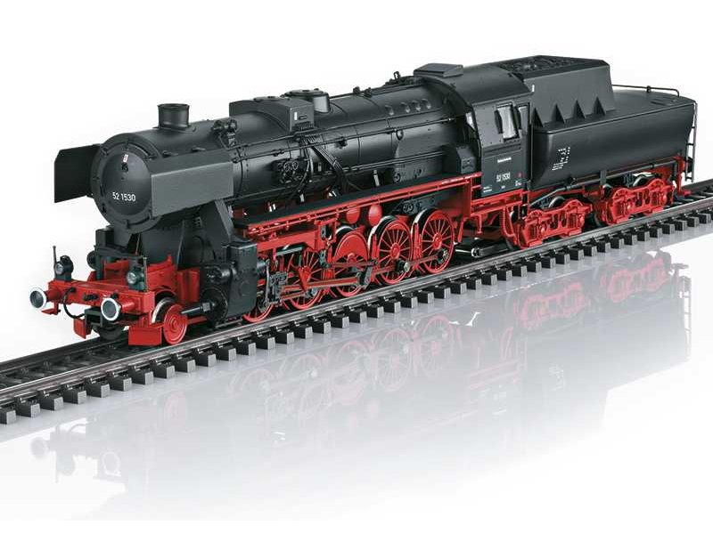 Vorbild: Schwere Güterzug-Dampflokomotive Baureihe 52, mit Wannentender 2´2´T30 der Deutschen Bundesbahn (DB). Schwarz/rote Grundfarbgebung. Witte-Windleitbleche mit geknickter oberer Kante. Vorlauf-Radsatz mit Vollrädern. Lok-Betriebsnummer 52 1530. Betriebszustand um 1951/52.