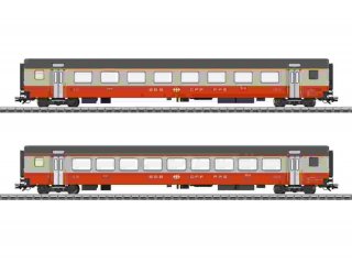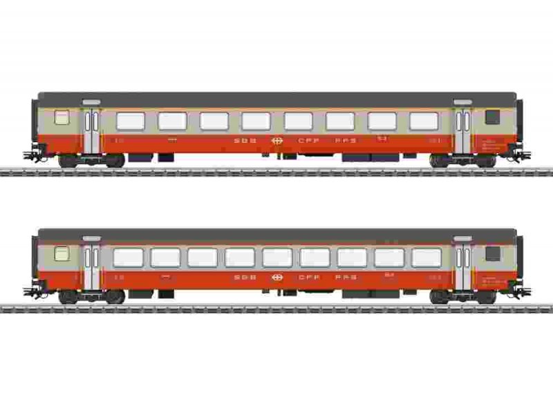 Vorbild: Zwei Einheits-Personenwagen Typ EWIII der Schweizerischen Bundesbahnen (SBB/CFF/FFS). Ein Großraumwagen Bauart A, 1. Klasse und ein Großraumwagen Bauart B, 2. Klasse. Kieselgrau/Blutorange Grundfarbgebung des Swiss Express. Zuglauf: Genève–Lausanne–Bern–Zürich HB. Wagen-Ordnungsnummern 2 und 12. Betriebszustand ab 1975.