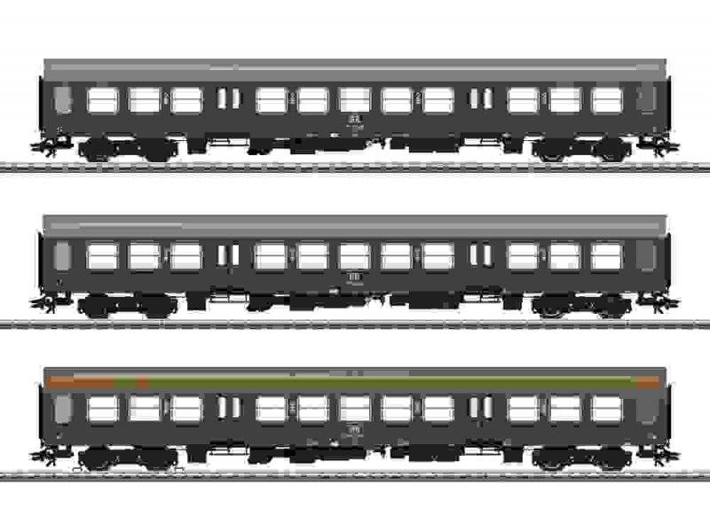 Vorbild: Drei Personenwagen Bauart Bmh, 2. Klasse, der Deutschen Reichsbahn (DR/DDR). Bauart Halberstädter Mitteleinstiegswagen. Zwei Wagen in dunkelgrüner (TGL 2233) und ein Wagen in chromoxidgrüner (TGL 2235) Grundfarbgebung. Betriebszustand Ende der 1980er-Jahre.