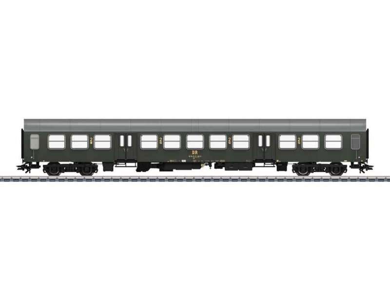 Vorbild: Personenwagen Bauart Bmh, 2. Klasse, der Deutschen Reichsbahn (DR/DDR). Bauart Halberstädter Mitteleinstiegswagen in dunkelgrüner (TGL 2233) Grundfarbgebung. Betriebszustand Ende der 1980er-Jahre.