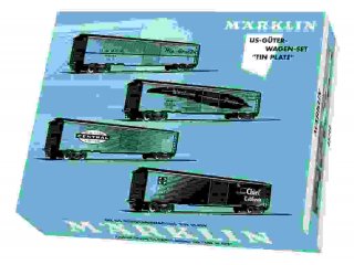 Vorbild: 4 US-Güterwagen unterschiedlicher amerikanischer Bahngesellschaften. 1 Box Car Rio Grande, 1 Box Car Western Pacific, 1 Box Car New York Central, 1 Box Car Santa Fe. Zustand für den Zeitraum der 1950er-/1960er-Jahre.