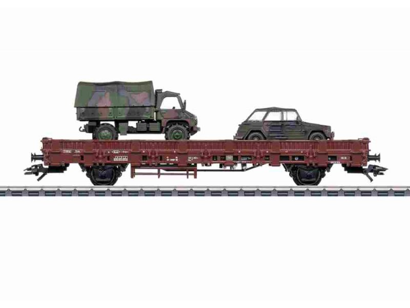 Modell: Rungen abnehmbar. Beladen mit einem Modell des Kübelwagens VW 181 und einem Modell des Unimog S 404 Pritsche/Plane der Deutschen Bundeswehr. Fahrzeughalterungen und einsteckbare Rungen liegen bei. Militärfahrzeug weitgehend aus Metall. Kennzeichen beschriftet. Diverse Ansteckteile aus Kunststoff beiliegend. Modelle der Militärfahrzeuge von Schuco. Länge über Puffer ca. 15,7 cm. Gleichstromradsatz E700580.