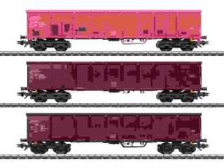 Vorbild: Set bestehend aus drei Hochbordwagen der Bauart Eanos-x 056 bzw. Eanos-x 052 der Deutschen Bahn AG. Unterschiedliche Grundfarbgebungen. Betriebszustand ab 2019.