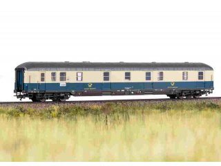 Vorbild: Bahnpostwagen Bauart Post mr-a der Deutschen Bundespost (DBP), eingestellt bei der Deutschen Bundesbahn (DB). Ausführung des Bahnpostwagens als Allespostwagen mit Abzugshaube für Kohleofen, seitlichen Luftansauglamellen und Luft-Umschalteinrichtung. Wagenlauf des Bahnpostwagens: Stuttgart – Schorndorf – Aalen – Stuttgart. Farbgebung in Ozeanblau/Elfenbein. Betriebszustand 1980.