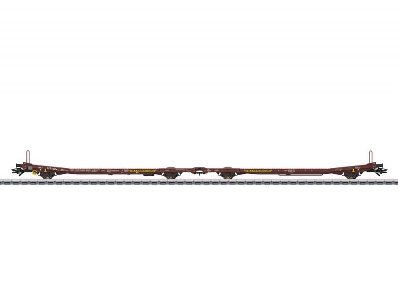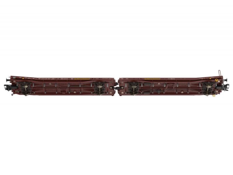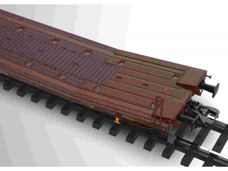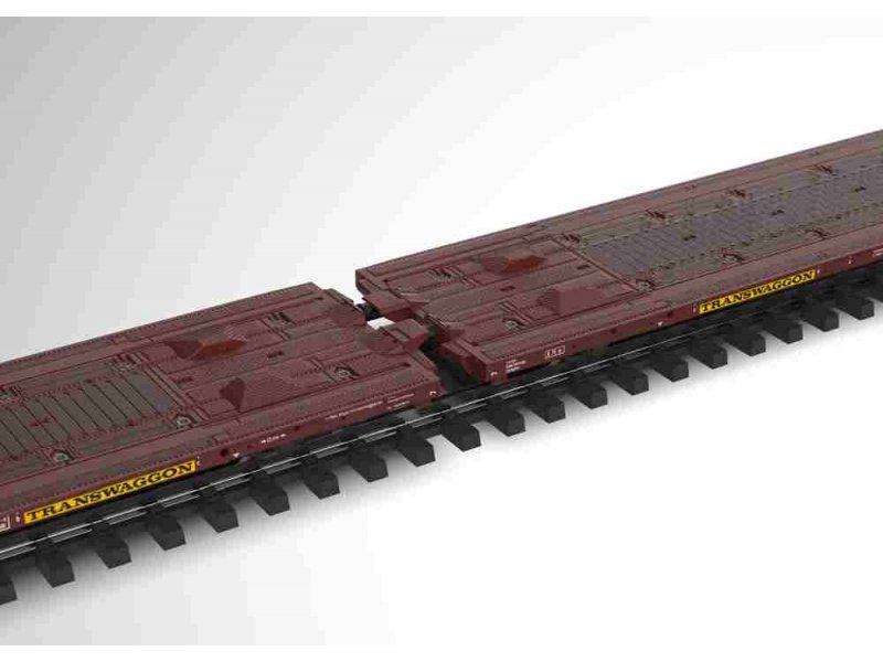 Vorbild: Flachwagen-Paar Bauart Laads 800B der Transwaggon GmbH, Hamburg. Rotbraune Grundfarbgebung. Betriebszustand ab 2005. Modell: Beide Flachwagenhälften aus Metall. Viele separat angesetzte Details wie Bremsleitungen, Luftbehälter, Überfahrbleche, Tritte und Bremsgestänge. Mit Handrad für Feststellbremse. Pufferhöhe nach NEM. Kinematikgeführte, starre Schraubenkupplung zwischen den Wagenhälften. Haltekeile für die Wagenoberseite, Haltekeile für den Wagenboden und Bremsschläuche liegen als separat ansteckbare Teile bei. Beladen mit vier VW Crafter von der Firma Schuco. Länge über Puffer 32,4 cm. Gleichstromradsatz E414237.