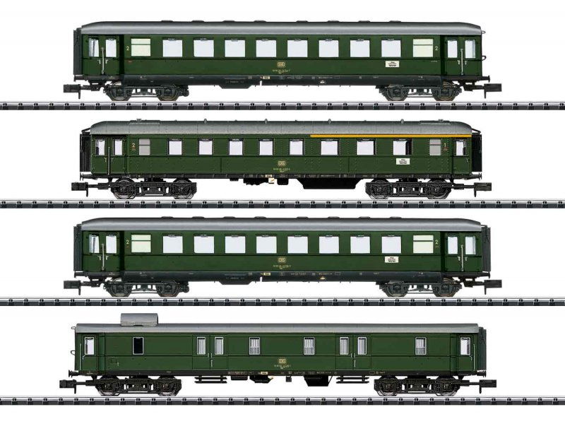 Vorbild: 2 Eilzugwagen 2. Klasse windschnittiger Bauart Bye 670, 1 Eilzugwagen 1./2. Klasse Bauart AByse 617 und 1 Reisezug-Gepäckwagen Bauart Düe 938 (Pw4ü-36) im Zustand um 1969 als E 4505 der Deutschen Bundesbahn (DB) in chromoxidgrüner Farbgebung.